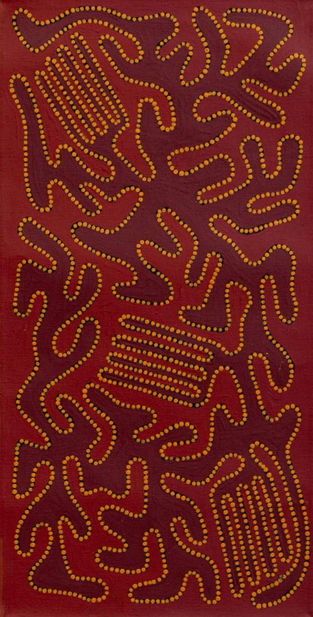 Adrian is the son of Joseph Jurra Tjapaltjarri, one of the great painters from Papunya tula Artists. Adrian started painting for Papunya Tula Artists in 2003.
